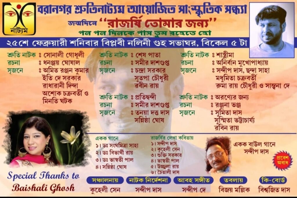कोलकाता : हिंदी टीवी एवं बॉलीवुड की चर्चित एक्ट्रेस “बैशाली घोष” के इकलौते भाई राजर्षि घोष का विगत 02 सितम्बर को पिछले वर्ष  कोलकाता में निधन हो गया था । राजर्षि  एक अच्छे बंगाली कलाकार थे। 24 फरवरी को उनके जन्मदिन पर उनकी याद में उनके परिवारीजन एवं मित्रो द्वारा 25 फरवरी को एक अनुष्ठान  का आयोजन किया गया  जहाँ पर उनकी याद में गाने और नाटक का मंचन किया गया एवं पिछले वर्ष राजर्षि लिखित किताब राजर्षि चिंतन जो की बैशाली द्वारा संकलित एवं प्रकाशित की गयी थी उससे कई कविताओं का पाठ भी इस अनुष्ठान में किया गया था।   इस कार्यक्रम के द्वाराराजर्षि घोष को याद करके उन्हें श्रद्धांजलि दी गयी।इस अनुष्ठान में अधिक संख्या में लोगों ने उपस्थित होकर राजर्षि को यादकर श्रद्धांजलि दी।