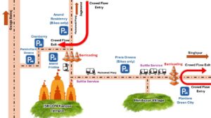 मेनावती रोड या गंगा बैराज से आने वाले श्रद्धालु — क्रैनबेरी, पुष्पोत्तम ग्रीन्स में चार पहिया पार्किंग उपलब्ध।