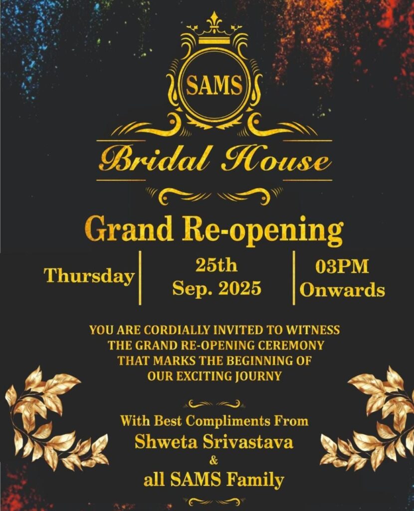 सलोनी तिवारी: फतेहपुर : शहर की प्रसिद्ध मेकअप आर्टिस्ट श्वेता श्रीवास्तव द्वारा संचालित SAMS Bridal House का भव्य ग्रैंड री-ओपनिंग 25 सितम्बर को शाम 3 बजे से आयोजित किया जा रहा है।