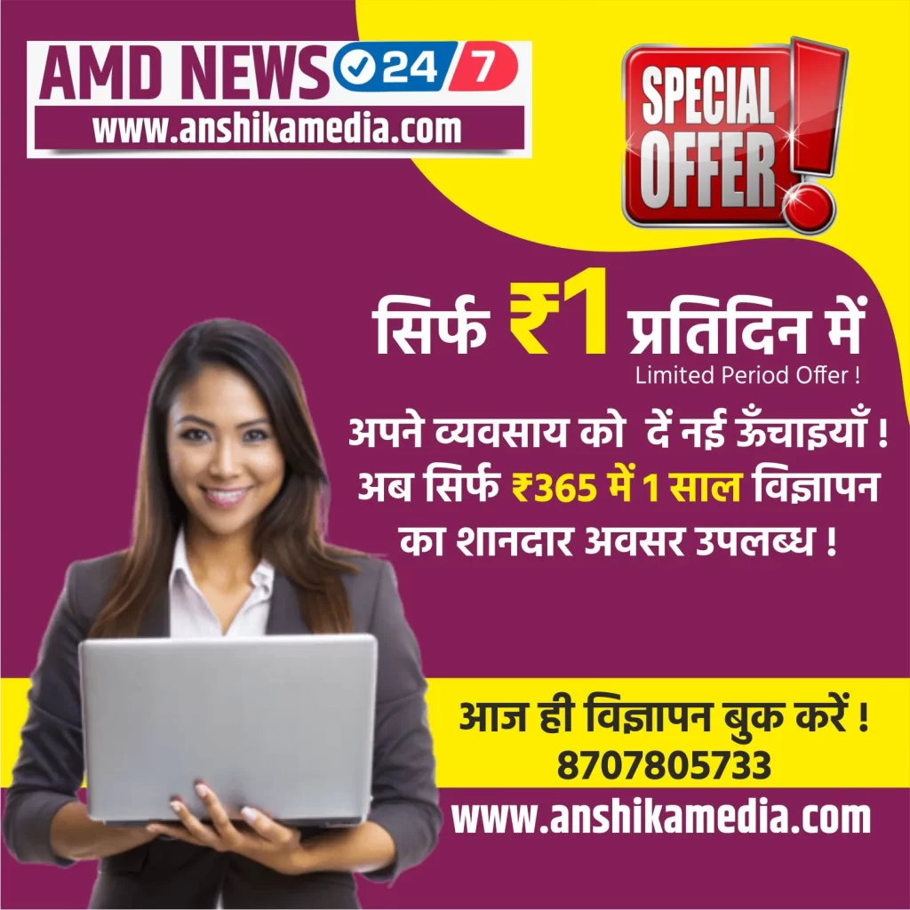 डिजिटल युग में हर छोटा-बड़ा व्यवसाय अपनी पहचान को ज्यादा से ज्यादा लोगों तक पहुँचाना चाहता है। इसी जरूरत को देखते हुए AMD न्यूज़ अपने पाठकों और छोटे कारोबारियों के लिए एक खास ऑफर लेकर आया है। अब मात्र ₹365 रुपये में पूरे एक वर्ष तक आप अपना विज्ञापन AMD न्यूज़ पोर्टल पर चला सकते हैं।