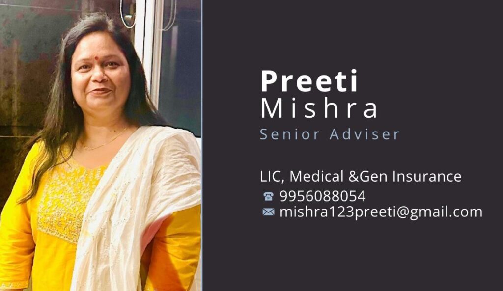 प्रीति मिश्रा एलआईसी, मेडिकल एवं जनरल इंश्योरेंस से जुड़ी हुई हैं और वर्षों से लोगों को सही बीमा योजनाओं की जानकारी देकर उन्हें आर्थिक सुरक्षा प्रदान करने में मदद कर रही हैं। उनका उद्देश्य सिर्फ पॉलिसी बेचने तक सीमित नहीं है, बल्कि वे ग्राहकों को उनकी जरूरत के अनुसार सही मार्गदर्शन देना प्राथमिकता मानती हैं।